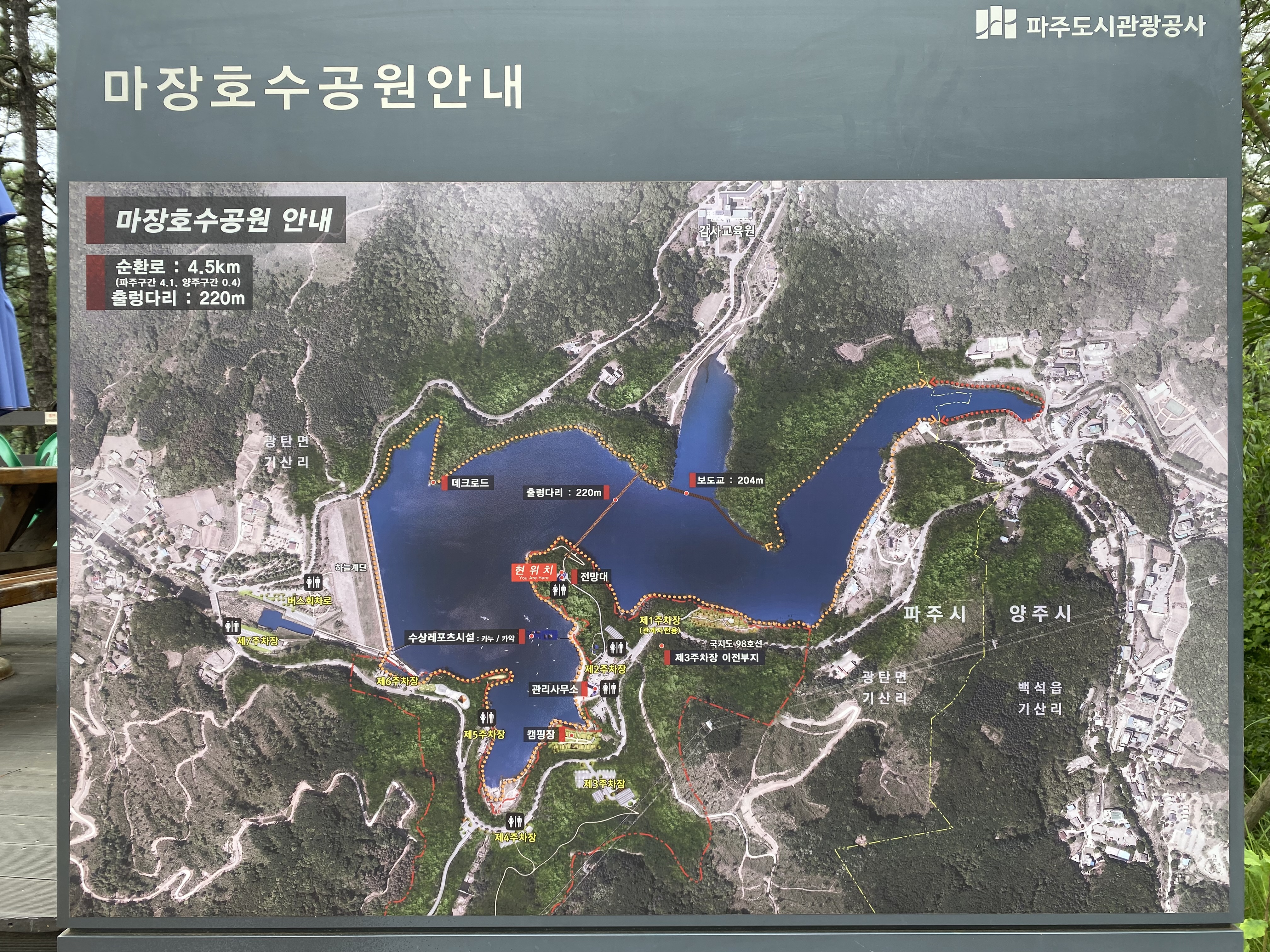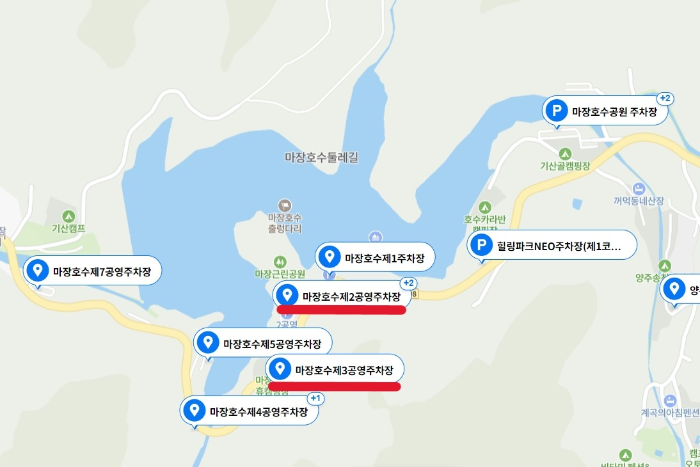 파주 마장호수는 경기도의 손꼽히는 명소 답게, 마장호수 주변 공영주차장이 7개 이상에 이르는데요. 출렁다리와 근접한 주차장은 '마장호수제2공영주차장'이에요. 가장 인기 많은 주차장이니 만큼, 주말에는 금세 만차가 되구요. 제2공영주차장이 만차 시에, '마장호수제3공영주차장' 이용을 추천드려요.